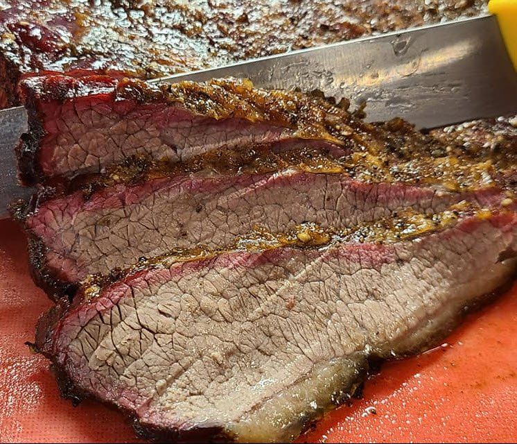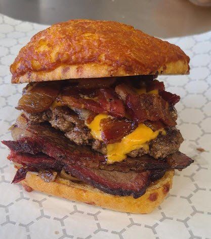 Toasted cheese bun, cheddar cheese, BBQ sauce Brisket, 4oz patty, fried onions, Bacon