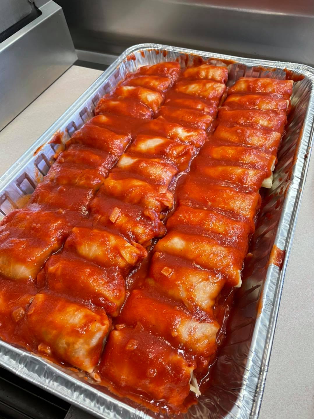 topped with homemade strawberry sauce and graham crumbs